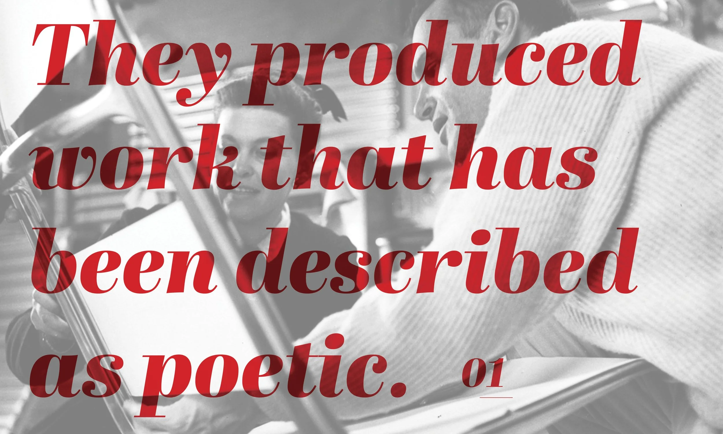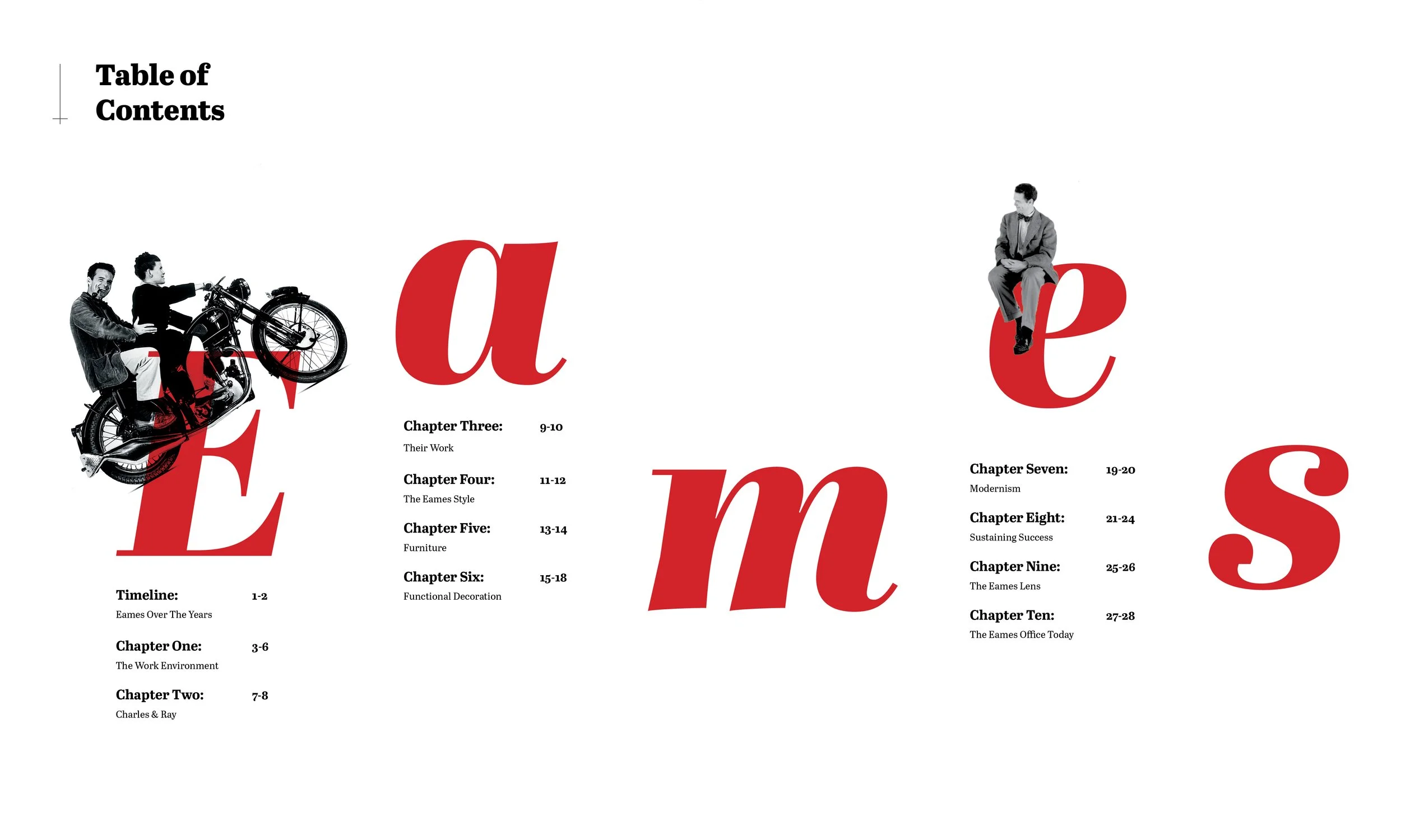 A minimal and bold color palette paired with a quirky and personable typeface reflects the Eames’ whimsical, yet sophisticated spirit. It portrays them as both designers and individuals.